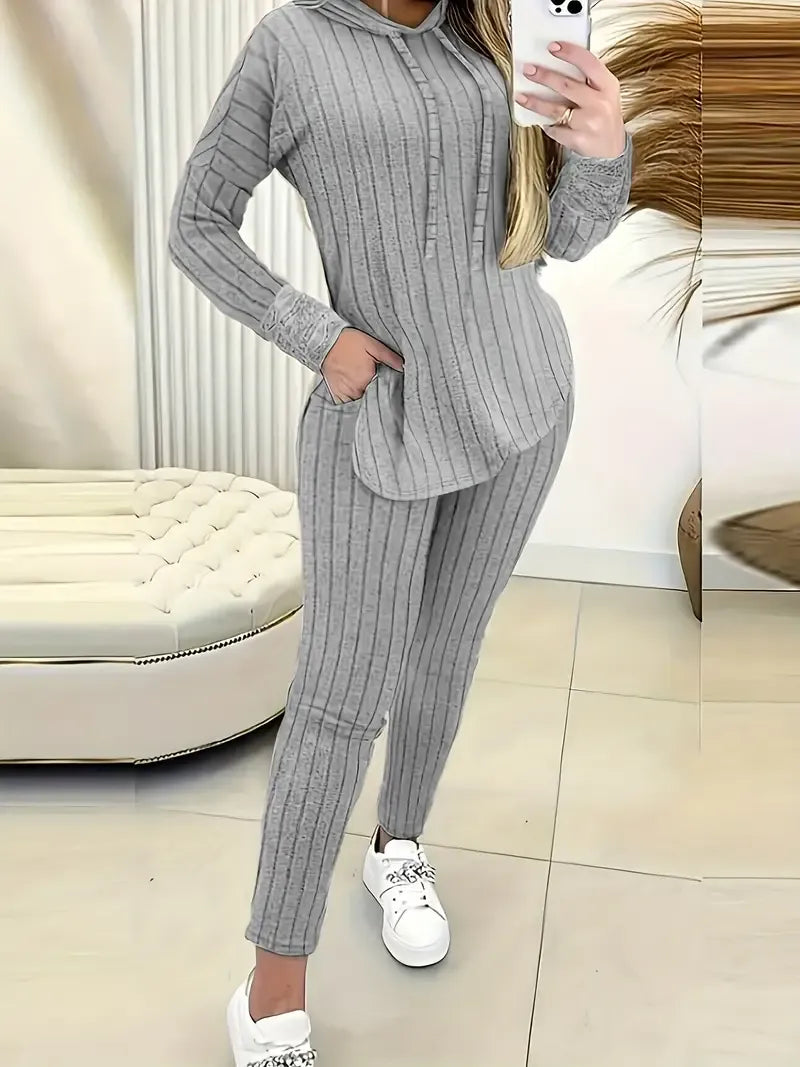 O conjunto Cátia é muito mais do que um look casual – representa a fusão perfeita entre comodidade, elegância e tendência. Projetado para mulheres que apreciam a moda sem abrir mão do bem-estar, Cátia irá envolvê-la com o seu tecido de alta qualidade e design moderno com capuz – uma escolha imprescindível para os seus dias de estilo descontraído.