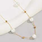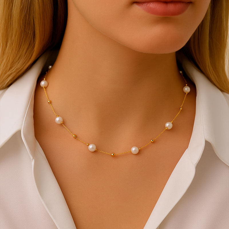 Um delicado colar que mistura com sofisticação as pérolas e as contas douradas numa corrente minimalista que vai acrescentar beleza a todas as suas toilettes.
