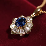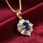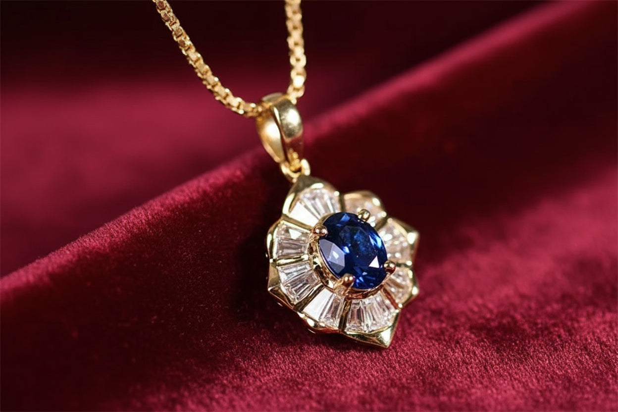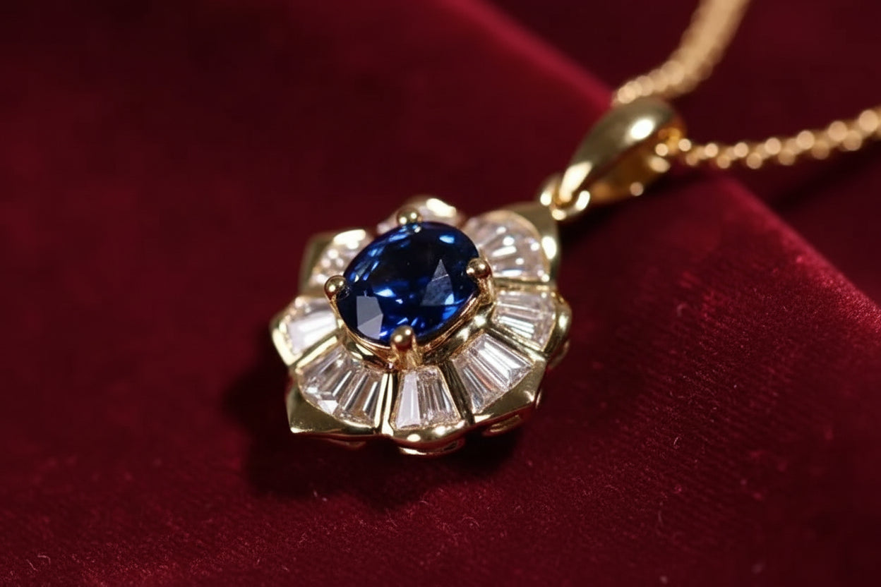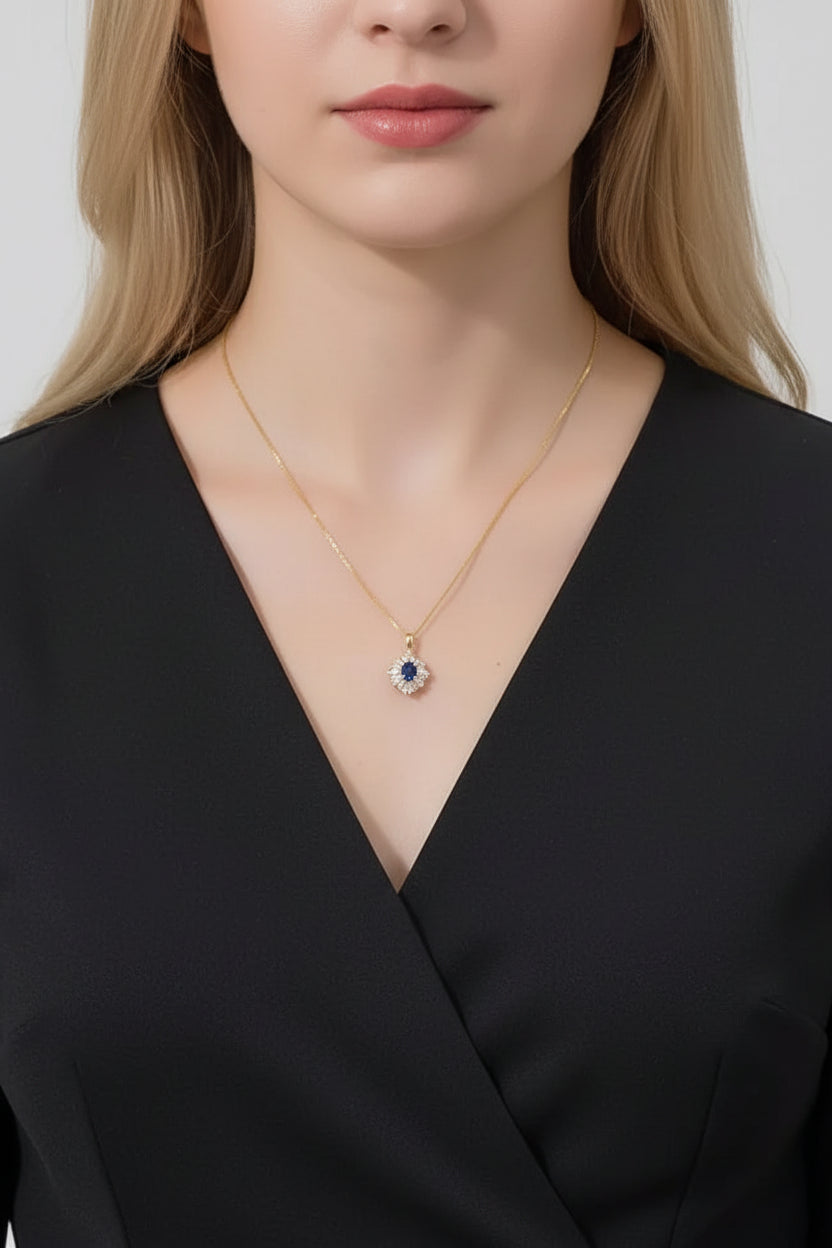 O colar Lady Di combina o brilho quente do ouro polido com a profunda atração de uma pedra azul meia-noite. Ousado, mas refinado, é uma peça intemporal que captura a beleza do contraste.
