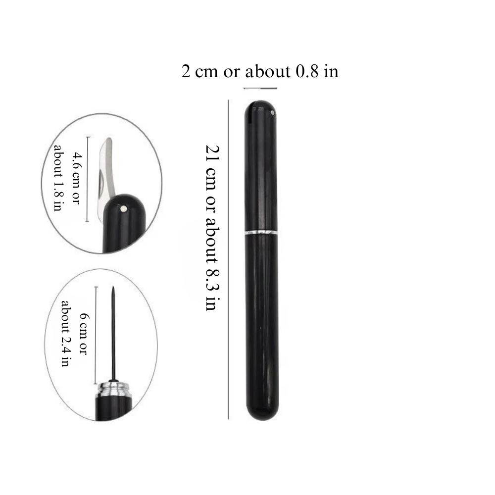 - As dimensões do saca-rolhas são 2 cm x 21 cm ou cerca de 0.8 in x 8.3 in.